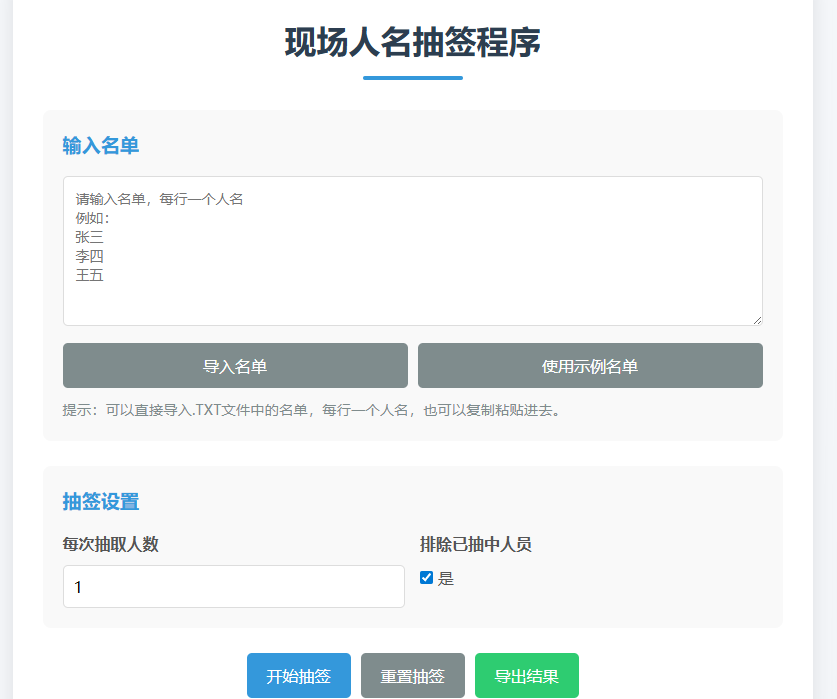 需要输入名单才能抽签。也就是说现场可以通过txt文件导入名单(注意,名单需要一行一个人名)。也可以直接粘贴人名到程序这里。可以直接复制EXCEL和WORD的内容粘贴。...