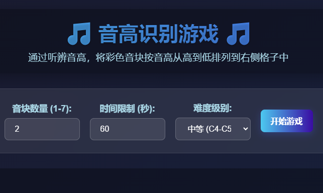 很适合小学生玩的音高识别程序。 游戏说明: 1. 设置音块数量、时间限制和难度级别,然后点击"开始游戏" 2. 点击或拖拽左侧的彩色音块可以听到其音高 (钢琴中央C组音阶) 3. 点击音块...
